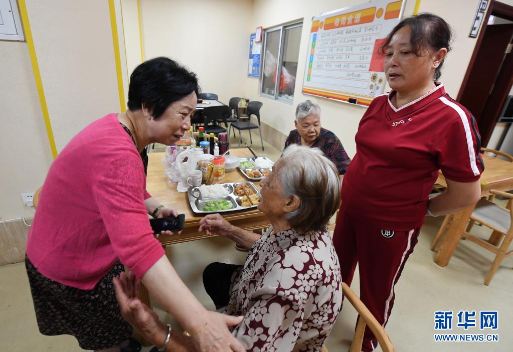 林丹(左一)在社區(qū)居家養(yǎng)老服務中心向徐佩英老人了解飲食健康情況(6月23日攝)。新華社記者 林善傳 攝
