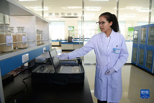 黑龍江北大荒建三江國家農業(yè)科技園區(qū)工作人員裴鑫宇在做谷物品質檢測(2018年9月27日攝)。新華社記者 王凱 攝
