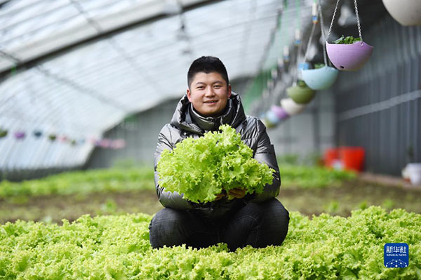 在黑龍江北大荒農墾集團雙峰農場有限公司果蔬產業(yè)園區(qū)智控溫室,工作人員在展示剛采摘的生菜(2021年3月5日攝)。新華社記者 王建威 攝