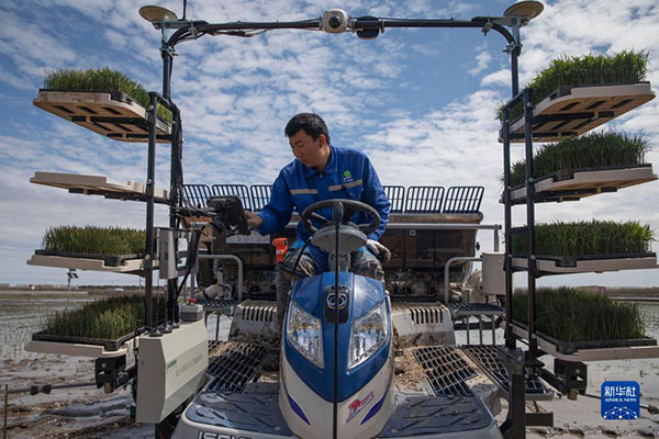 在北大荒集團紅衛(wèi)農場有限公司智慧農業(yè)先行示范區(qū)內,工作人員設置無人駕駛插秧機工作路徑(2021年5月11日攝)。新華社記者 張濤 攝