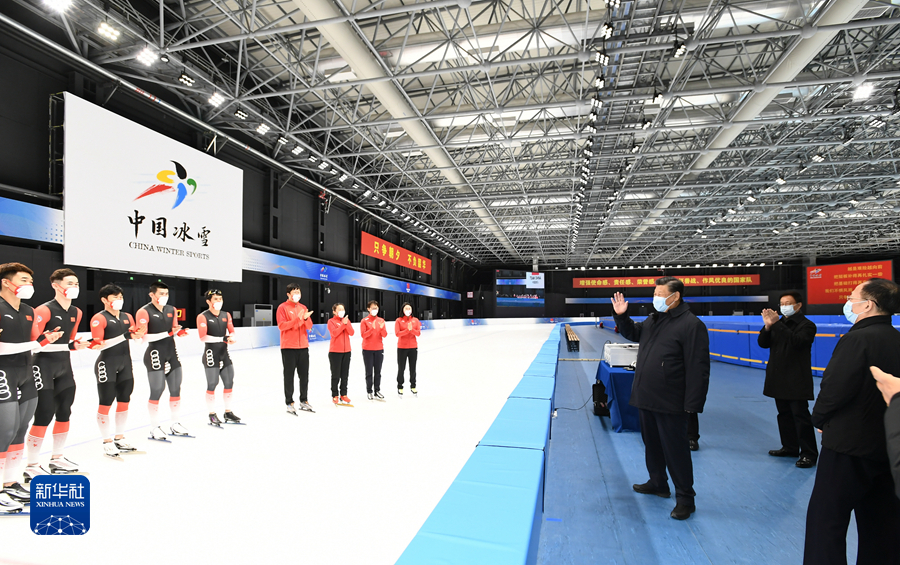 1月4日,中共中央總書記、國家主席、中央軍委主席習近平在北京考察2022年冬奧會、冬殘奧會籌辦備賽工作。這是4日下午,習近平在二七廠冰雪項目訓(xùn)練基地速滑館,向參訓(xùn)運動員、教練員表示慰問。新華社記者 謝環(huán)馳 攝