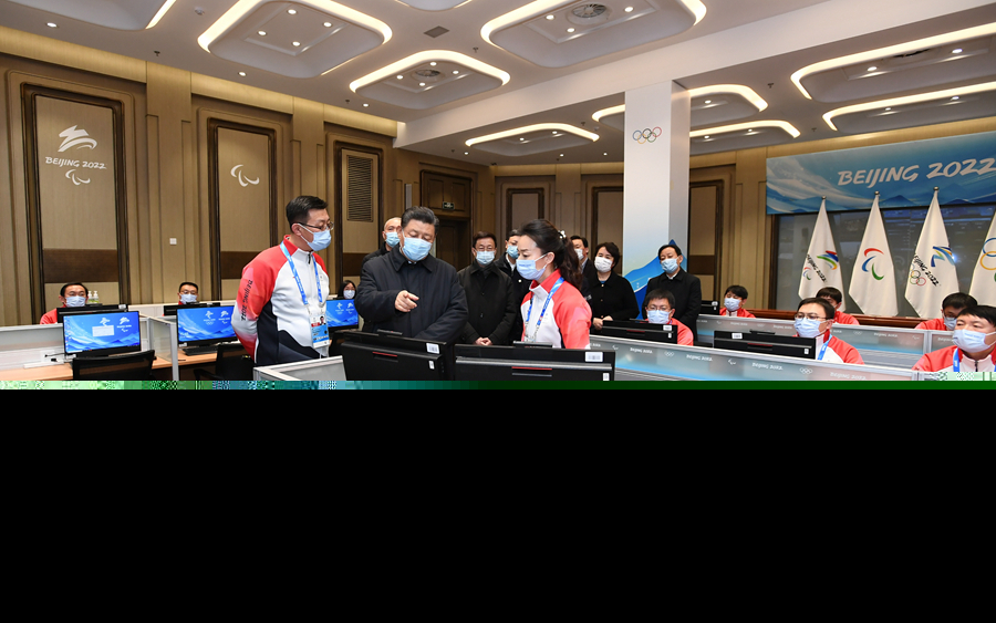 1月4日,中共中央總書記、國家主席、中央軍委主席習近平在北京考察2022年冬奧會、冬殘奧會籌辦備賽工作。這是4日下午,習近平在北京冬奧運行指揮部調(diào)度中心考察。新華社記者 謝環(huán)馳 攝