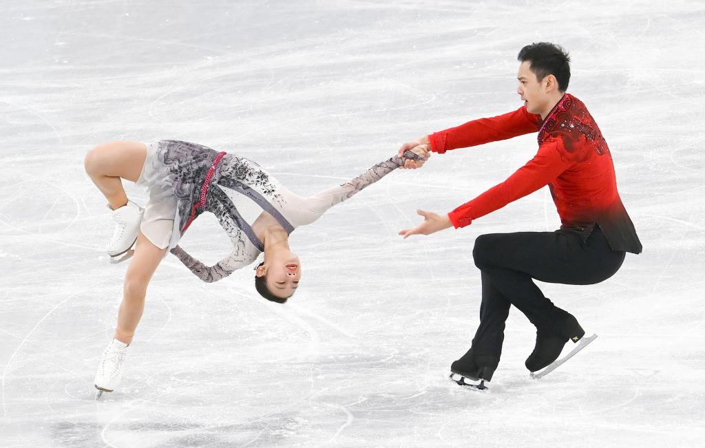 2月7日,中國選手彭程(左)、金楊在北京2022年冬奧會(huì)花樣滑冰團(tuán)體賽雙人滑自由滑比賽中。新華社記者劉瀟攝