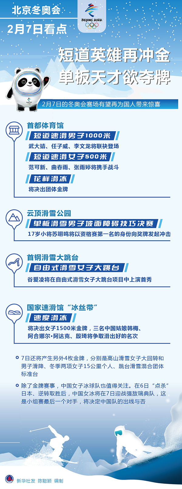 新華社北京2月6日電(記者張澤偉 王恒志)7日的冬奧會賽場有望再為國人帶來驚喜。為中國代表團(tuán)摘得首金的武大靖、任子威、范可新、曲春雨將再登冰場,沖擊短道速滑男子1000米和女子500米金牌。以資格賽頭名晉級的中國單板滑雪小將蘇翊鳴,將拿出更難的動作沖擊男子坡面障礙技巧獎牌,書寫中國雪上項目新的歷史。谷愛凌則將在自由式滑雪大跳臺項目中上演冬奧首秀。