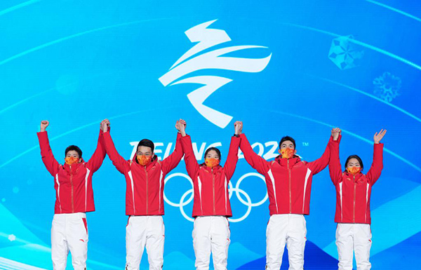 5日晚獲得短道速滑混合團體接力冠軍的中國隊成員,武大靖、任子威、范可新、曲春雨、張雨婷登臺領獎。國際奧委會副主席于再清為獲獎隊伍頒獎,隨后現場升中華人民共和國國旗、奏中華人民共和國國歌。