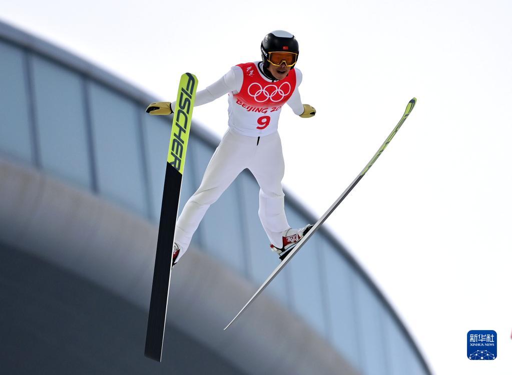 2月9日,中國(guó)選手趙嘉文在跳臺(tái)滑雪比賽中。新華社記者詹彥攝