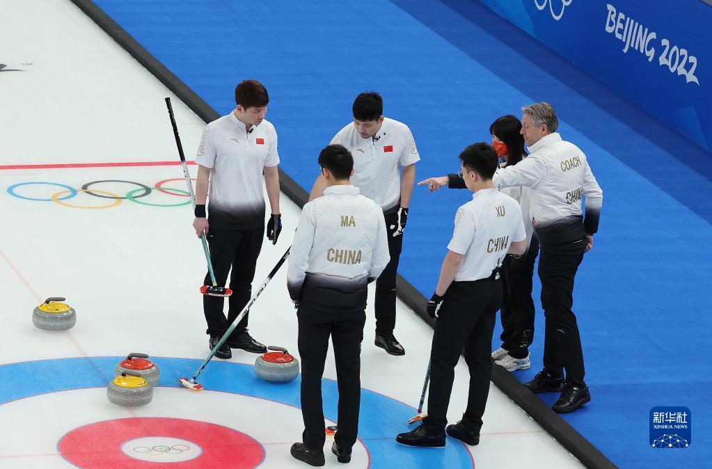 2月11日,中國隊(duì)在比賽中商討戰(zhàn)術(shù)。