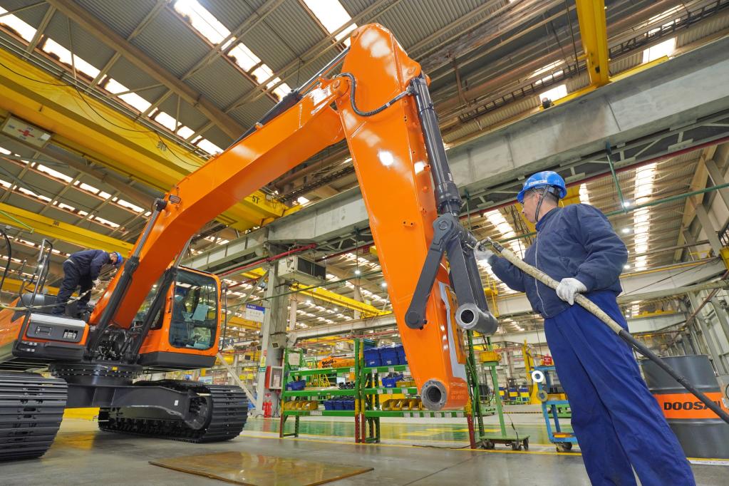 2月7日,在山東煙臺一家工程機械生產(chǎn)企業(yè),工人在生產(chǎn)車間內(nèi)忙碌。新華社發(fā)(唐克攝)