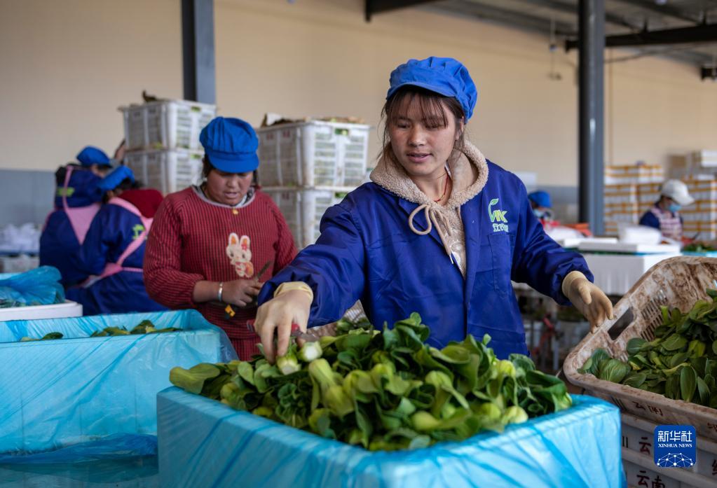 3月3日,脫貧群眾在云南省曲靖市會澤縣一蔬菜冷鏈企業(yè)分揀蔬菜。新華社記者 陳欣波 攝