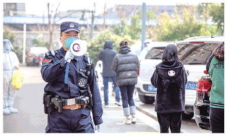 圖為朱華勇在核酸采集現(xiàn)場(chǎng)維持秩序。 秦培芳 攝