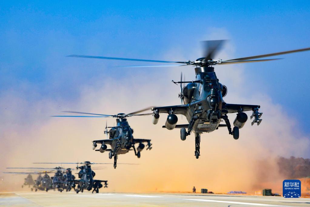 陸軍第73集團(tuán)軍某陸航旅組織飛行訓(xùn)練,戰(zhàn)機(jī)編隊依次起飛(2021年4月22日攝)。新華社發(fā)(李士龍 攝)